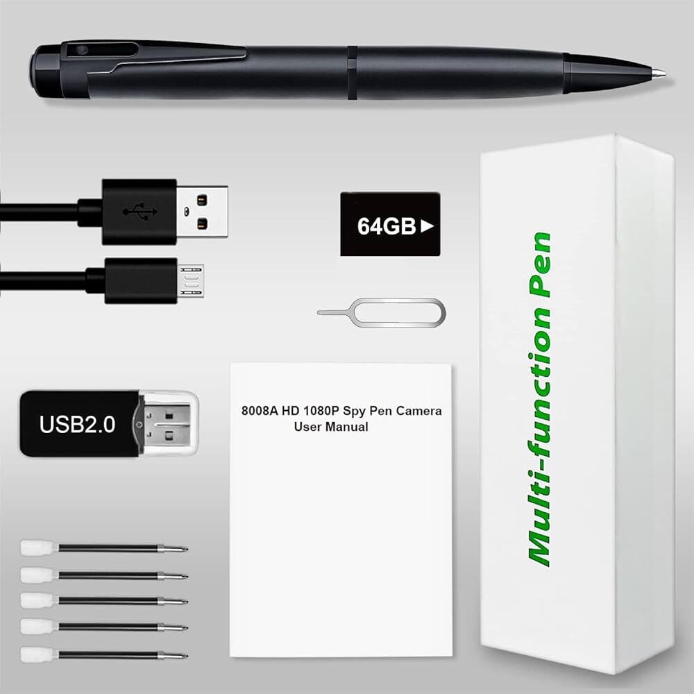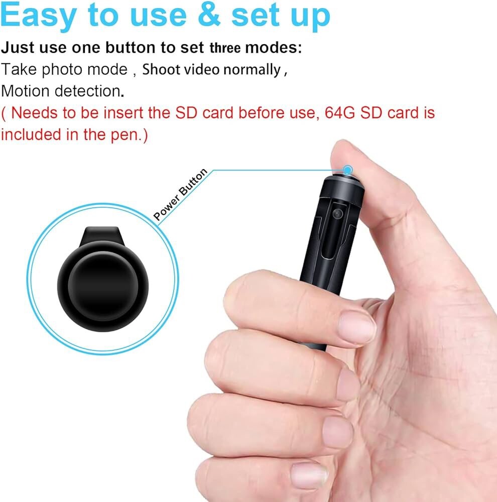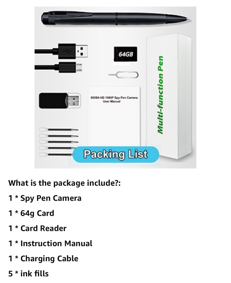 Features & details đ„ ăHidden Camera Penă The Hidden Camera Pen is very portable and you’ll be able to use it anytime, anywhere in your day-to-day life. As an example, you’ll be able to use it at home, in the office, outdoors, and so forth. The operation is very simple. đ„ăBuilt-in 64GB SD cardă The Hidden Camera Pen carries a 64GB SD card for simple use. In addition, the Spy camera records in a loop, so when the memory card is full, it automatically overwrites the contents of the earliest recorded video. (Includes 64GB of memory) đ„ă1080P Full HD Camă 1080P hidden video camera, clear picture, providing high-quality video quality. đ„ăMotion Detectionă Motion detection function can also be detected in keeping with the movement of the object, which is of great help to circle of relatives safety. As soon as the object is detected to move, it’s going to automatically record. đ„ăAfter-Sales Serviceă Carrying instructions, if you lose instructions, please contact us in time. The camera pen can also write notes, jot down schedules, or take into account that important information. Product information Package Dimensionsâ6.65 x 2.2 x 1.65 inches Item Weightâ6.4 ounces ASINâB0CQ1WZXS7 BatteriesâLithium Polymer batteries required. (included)