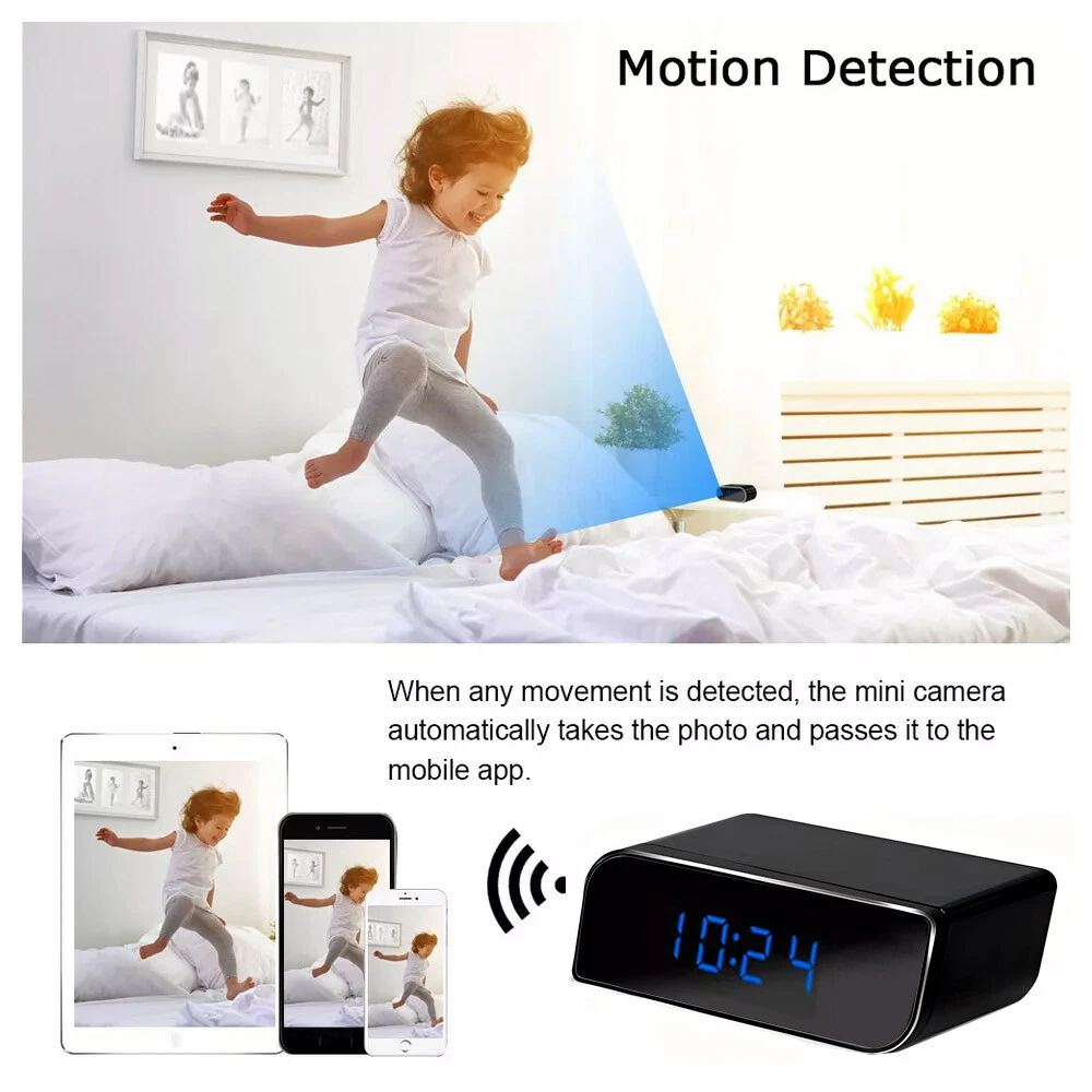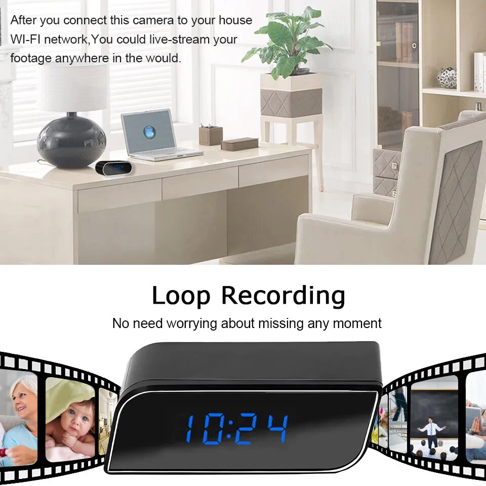 Perfect Design Spy Camera Hidden Camera with 140¡ã Wide Angle Lens for Home Security: This full HD 1080P WiFi camera clock is concealed in what looks like a normal clock. You’ll be able to put this spy camera hidden camera IP camera on the desk or bookshelf and it is totally not noticeable whilst the camera is recording. Wi-Fi Streaming By the use of IOS/ Android APP: This wireless Wi-Fi spy camera hidden camera in clock might be connected to the internet network, so you need to live-stream your footage from anywhere on the planet. Just download the app and follow the instruction book, then you’ll be able to see the whole thing happens on your phone, tablet or computer. Night Vision & Motion Detection & Alarm Push Surveillance Camera: This spy mini surveillance camera alarm clock built-in 6 night vision IR, You’ll be able to see faces and details clearly even in total darkness. Day or night, you¡¯ll know exactly who¡¯s coming into your house or workplace when you¡¯re not around. Alarm notifications will be pushed to your cell phone once the motion is activated, and will snapshot photos on APP. instant alarm pictures will be sent By the use of email(please set on PC HD 1080P Video & Multifunction APP Mini IP Camera Remote Video Recorder: This smart alarm nanny camera clock with Crystal clear HD 1080P video 150 degree wide angle lens, 4x digital zoom HD displays with H.264 compression. Reinforce all time recording, alarm recording, time recording on micro SD card; Snapshot, adjust resolution (1080P, 720P, 640P),Left/Right/Up/Down Reversal, Contrast/Brightness Package Included: 1 x HD Camera 1 x USB Charging Cable 1 x User Manual 1 x 32GB Memory Card Note:This product will automatically generate network time after connecting to Wifi, no additional settings are required.