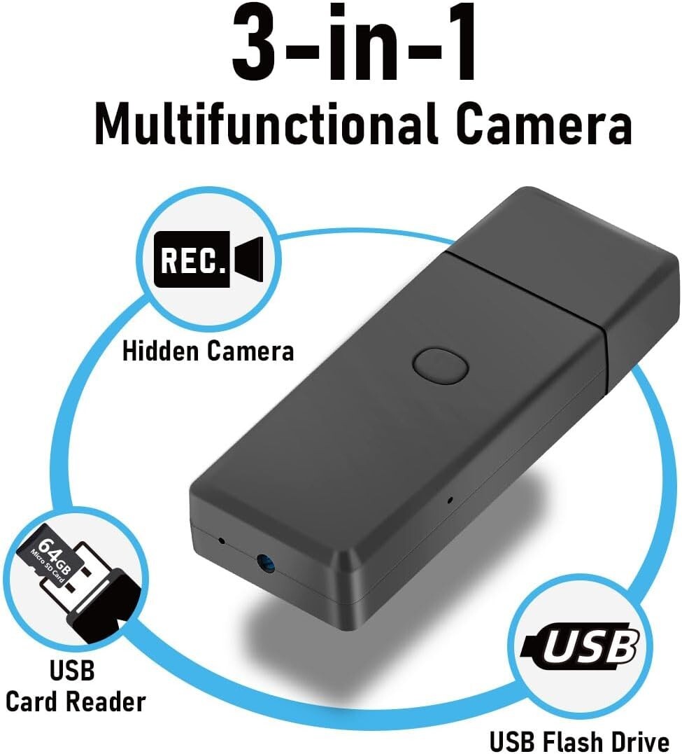 【Mini Portable Hidden Cameras】 This hidden video camera is small and portable, You’ll use it anytime and anywhere in your daily life,such as in meetings,business negotiations,office surveillance,legal occasions and so on.【Mini Spy Camera 1080P】 This mini hidden cameras provides 1920 * 1080P HD video quality. You’ll take the portable spy camera anywhere, no one will realize that it is a camera.The Mini camera has a built-in 300mAh battery,can beef up up to 150 minutes of recording time when fully charged.【Built-in 64GB Memory card】 This spy video cameras built-in a 64GB memory card,for you to let you no longer miss any important and exciting moments.(64GB card included).【Easy to Use】One-click switch design is easy to use.No need extra accessories,no want to setup,no need APP and WiFi.The hidden cameras can be utilized directly after received and fully charged.【3-in-1 Multi-Function】 This small video camera will also be used as a standard USB flash drive for data storage and card reader for SD/TF memory card.This can be a multifunctional product!