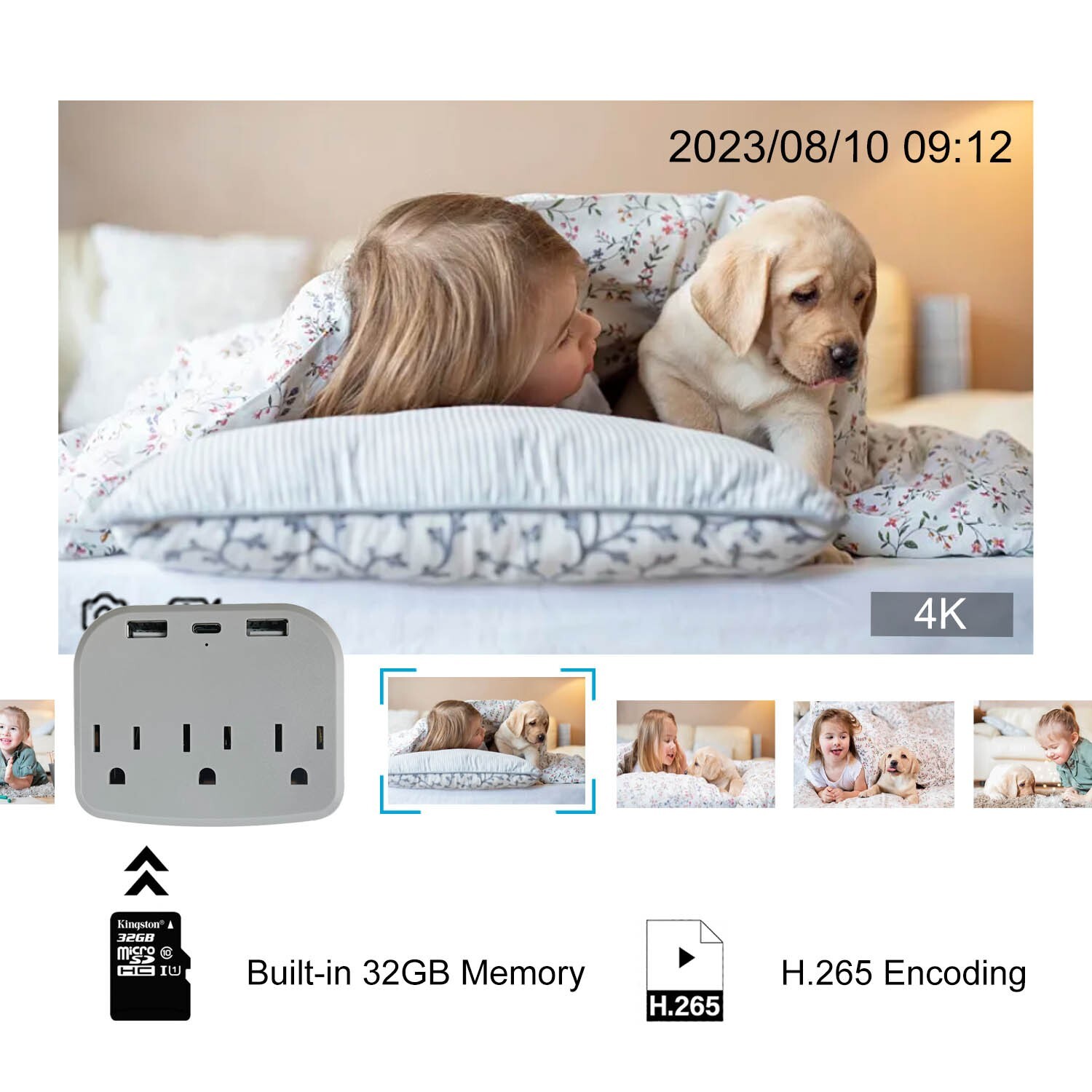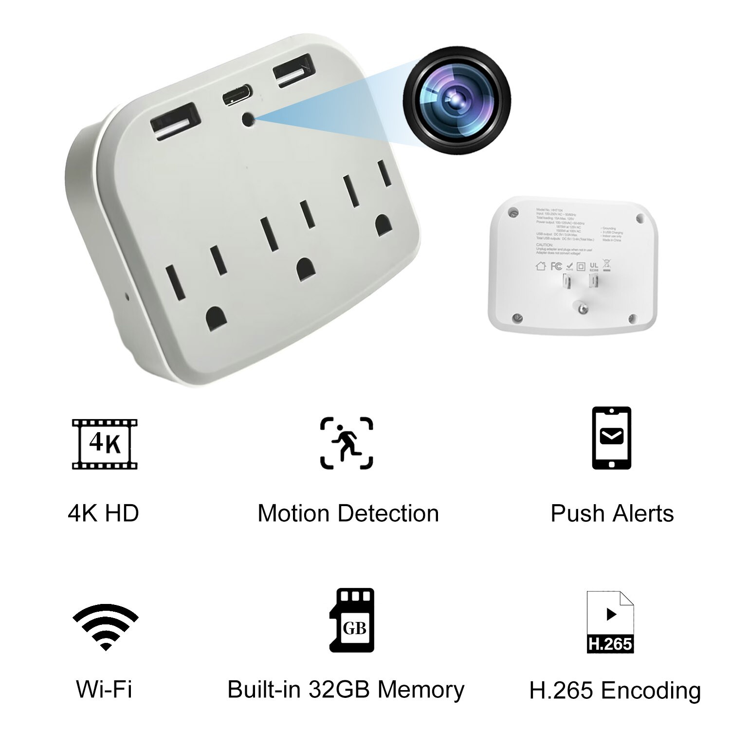 4K Hidden Camera Power Strip Audio WiFi Remote Viewing Spy Cam Wall Charger