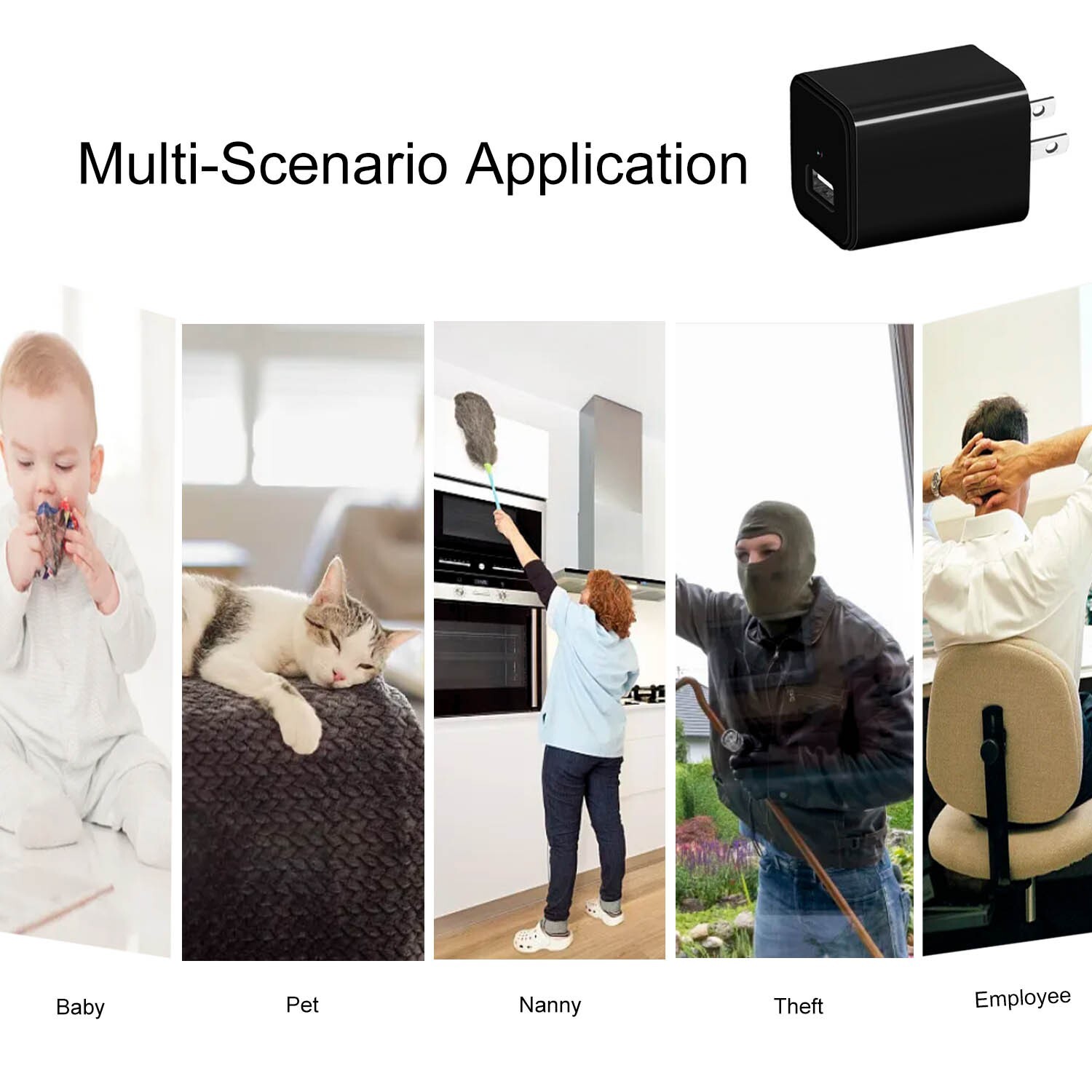 Feature Description: *Hidden Camera Charger: This hidden camera offers a high level of concealment. It may be plugged into a wall and used in connection with an app, offering simple and convenient usage. Suitable for indoor settings such as homes, offices, hotels, stores, and other identical locations. *1080P Resolution: This spy camera offers crisp and detailed high-definition video with its 1080P resolution, guaranteeing that each aspect of your recordings is captured with exceptional clarity. *Wi-Fi Enabled Remote Viewing: This hidden camera means that you can monitor live footage remotely over a Wi-Fi connection. Enjoy the flexibility of watching from any location at any time, free from the constraints of time and distance. *Motion Detection: This spy camera is designed to start recording robotically upon detecting any motion, ensuring that necessary moments don’t seem to be missed. *Storage Capacity: This hidden camera is compatible with micro SD cards as much as 128GB(not included), offering ample storage space for your entire recording needs. *Easy to make use of, plug and play Package Included: 1*Mini Hidden Camera Charger 1*USB Cable 1*User manual