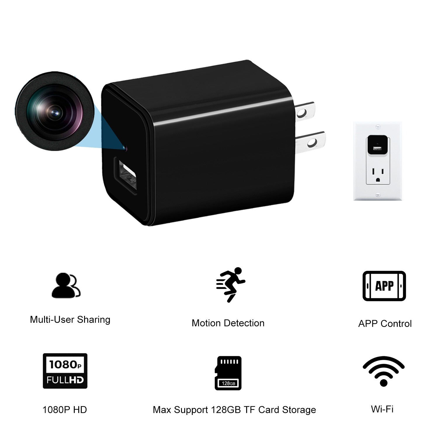 Hidden Camera Charger Wi-Fi Remote Live Viewing 1080 HD Discreet Spy Nanny Cam