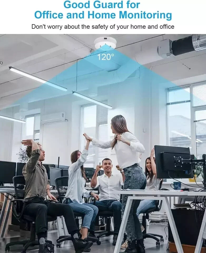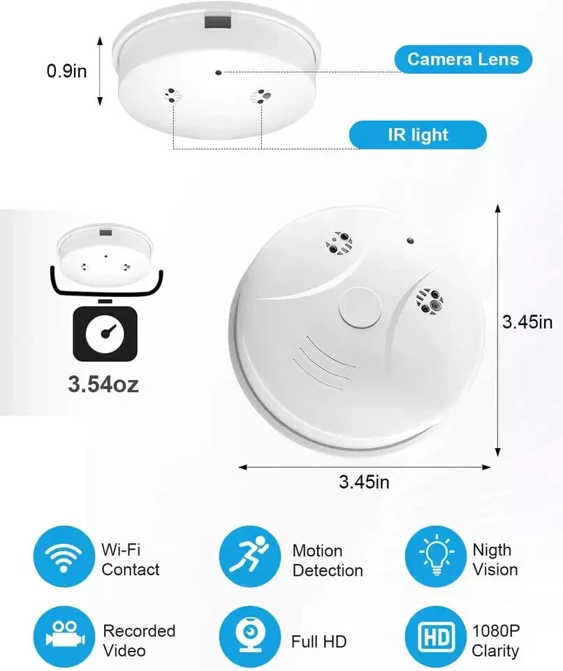 About this item:【Full HD Camera】Enjoy a clear and sharp 1080P real-time screen, and can record HD 1080P at 150° angle. View your home anytime, anywhere. No Audio recording. Keep your circle of relatives secure without worrying about what is going to happen to your baby, pets, or nanny in the house. You’ll be able to remotely stream videos and download videos and photos to your smart devices. 【Offer protection to your circle of relatives and property】 With the 𝐇𝐢𝐝𝐝𝐞𝐧 WiFi camera, You’ll be able to watch over babysitters, your kids, house cleaners, or staff members to stop thieves from stealing in homes, workplaces and other places. Install such cameras for home to bring you peace of mind.【2 in 1 Full HD Security Camera】The 1080P clear real-time screen and wireless mini camera with 4 infrared lights greatly strengthen night vision. Even in a dark environment, it is possible for you to to see details and Offer protection to your children, circle of relatives and your personal property.This WiFi camera is disguised as a smoke detector. It just looks like a smoke detector, it doesn’t in fact function as a smoke detector. Use your existing WiFi router to keep watch over the camera.【Easy Setup, Easy to Use】Setting up this camera is easy – just scan a code. No technical knowledge is required. Once the camera is set up, You’ll be able to view live video on your phone from WiFi or mobile data, no matter at home or on the go.【Motion Sensing & Alert Push】After recognizing the motion, the camera will send a push notification with the image to your phone. You’ll be able to log into the app to see what is going on. The camera automatically saves and overwrites the oldest SD card files to continue working when it is full.