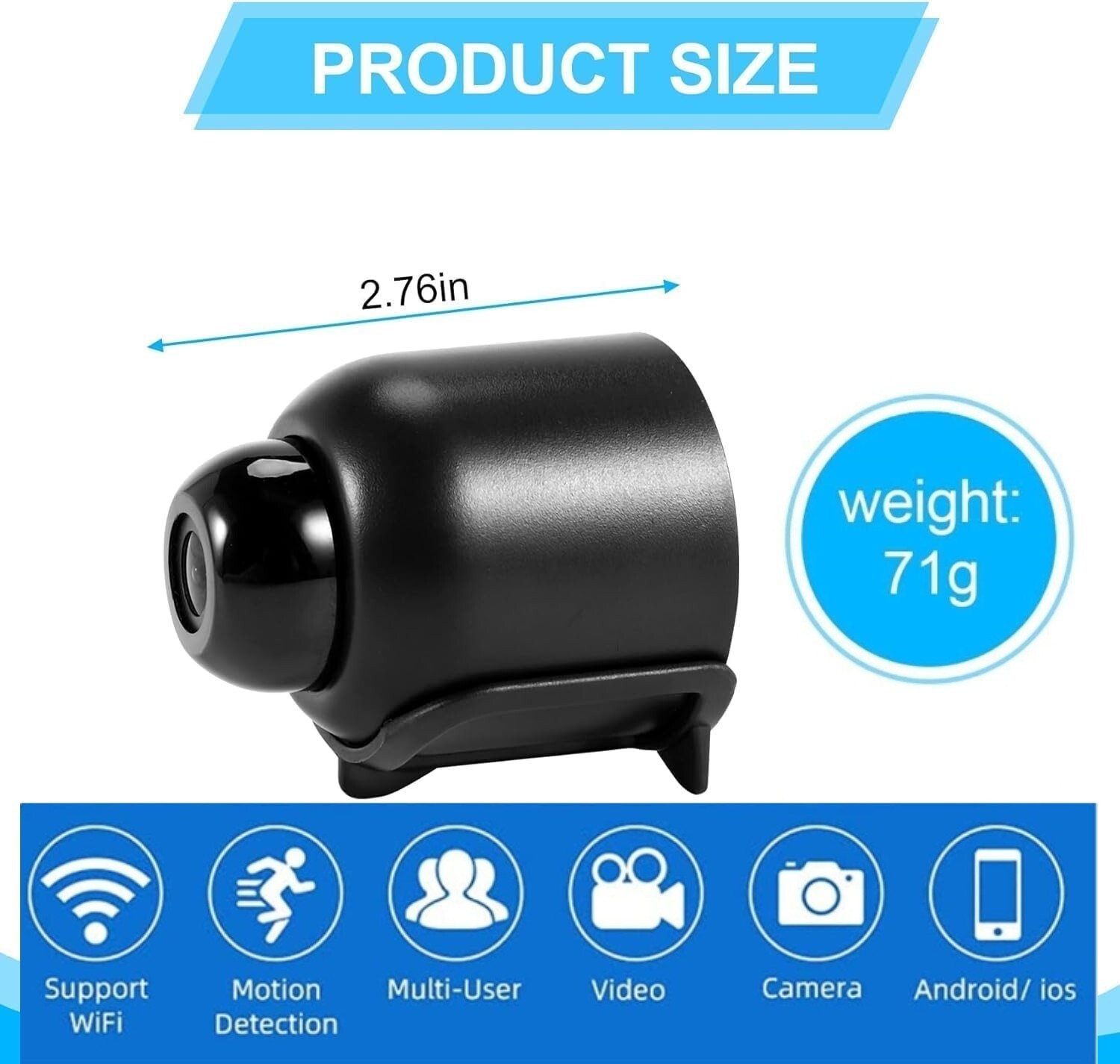 Description:150°Super Wide Angle, HD Picture Quality All through Day And Night: In comparison to other cameras that appear red or purple images, our cameras clear image feature is sure to impress you, so you dont have to worry about video color anymore! WiFi Monitor Camera: For a small piece of equipment, this mini security camera integrates a long list of useful features including 150° Wide Angle Lens, 1080P HD Video,No-Glow Night Vision, Remote Record/Snapshot/Playback, SD Card Record, and Built-in Magnet.Wireless Wifi Camera: Perfect surveillance equipment for protecting your home and loved ones. With a quick free-app download, youll be capable of enjoy instant feed from the cam anywhere.Specification:Colour: BlackMaterial: ABSResolution: 1080PFrame number: 30/25Viewing angle: 150 degreesWiFi connection: 2.4GWiFiThe device has its own AP hotspot: YesMobile detection: Not supportedDetect alarm: Not supportedPower consumption: 5VSupply voltage: 5V1ARated Voltage:100V-240VUse scene: indoorSize: 5*4.5*4.5cmColor: blackVideo Format: AVIMemory Card Type: Improve Micro SD card up to 128GB, (SD isn’t included)Compressed Format: H.264APP Improve: Android/iOSBuilt in battery: 180 mAhBattery working time: 1 HourPackage Included: Camera USB Charging Cable Improve Stand ManualInstructions to be used:Step 1: Download and install the APPStep 2: Connect the camera with the power supply and turn at the camera. Step 3: Turn at the APP and add a device (prompt that you wish to have to turn at the bluetooth of your cellphone).Step 4: Choose 2.4G wifi and enter the password of the wifi.Step 5: Long press the “Mode” button of the camera. Then the indicator light flashes blue.Step 6: APP finds and connects devices. Wait 1-2 minutes and then connecting successfully. The indicator light is at all times blue.