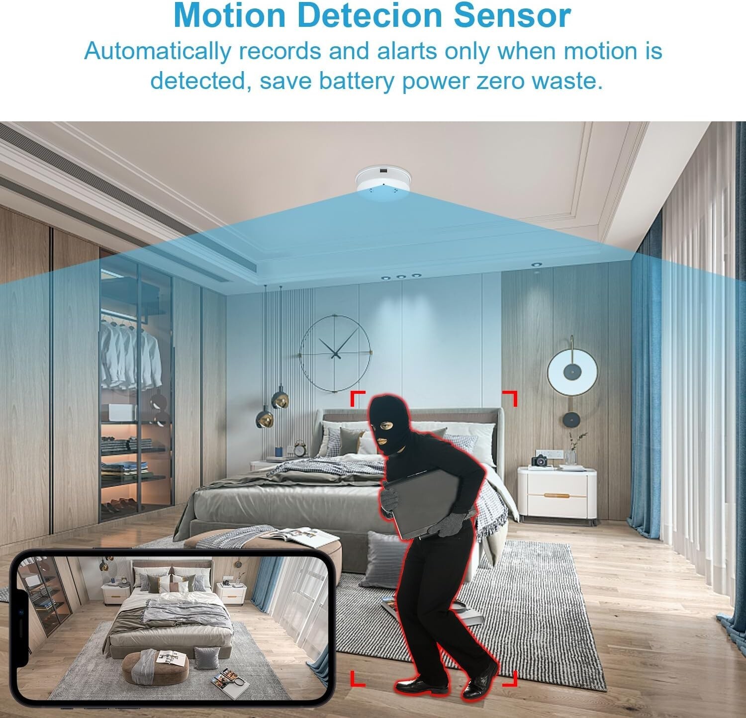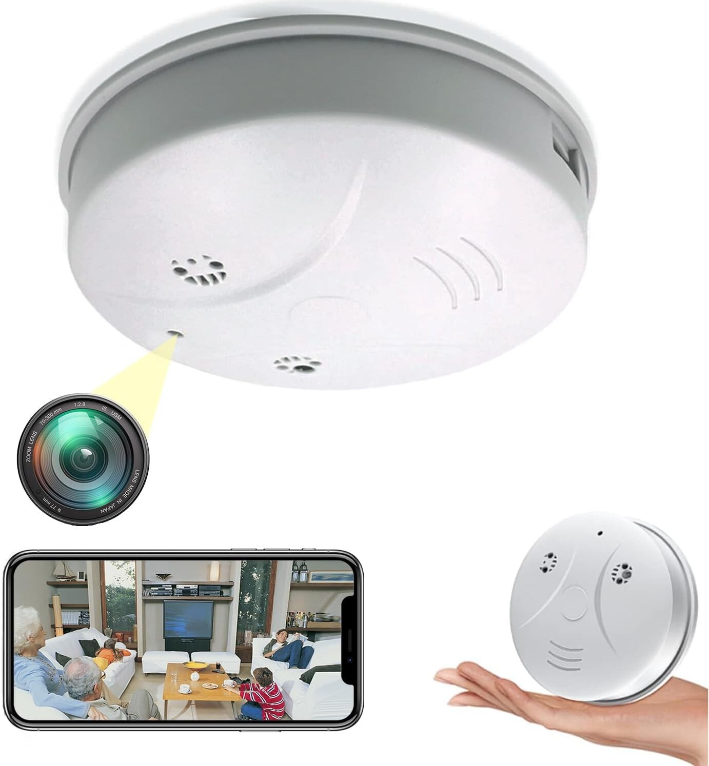 Spy Hidden Camera WiFi Battery Real Smoke Detector 1080p Audio & Video Recording Description:2 in 1 Full HD Security Camera-The 1080P clear real-time screen and wireless mini camera with 4 infrared lights greatly give a boost to night vision. Even in a dark environment, it is possible for you to to see details and offer protection to your children, family and your personal property.This WiFi camera is disguised as a smoke detector. It just looks like a smoke detector, it doesn’t if truth be told function as a smoke detector. Use your existing WiFi router to keep an eye on the cameraFull HD Camera-Enjoy a clear and sharp 1080P real-time screen, and can record HD 1080P at 150° angle. View your home anytime, anywhere. Keep your family protected without worrying about what will happen to your baby, pets, or nanny in the house. You’ll be able to remotely stream videos and download videos and photos to your smart devices.Easy Setup, Easy to Use-Setting up this camera is easy – just scan a code.No technical knowledge is required.Once the camera is set up, You’ll be able to view live video on your phone from WiFi or mobile data, no matter at home or on the go.Motion Sensing & Alert Push-After recognizing the motion, the camera will send a push notification with the image to your phone. You’ll be able to log into the app to see what is going on. The camera automatically saves and overwrites the oldest SD card files to continue working when it is full.Will have to you have any questions, you are more than welcome to contact us. Thanks!